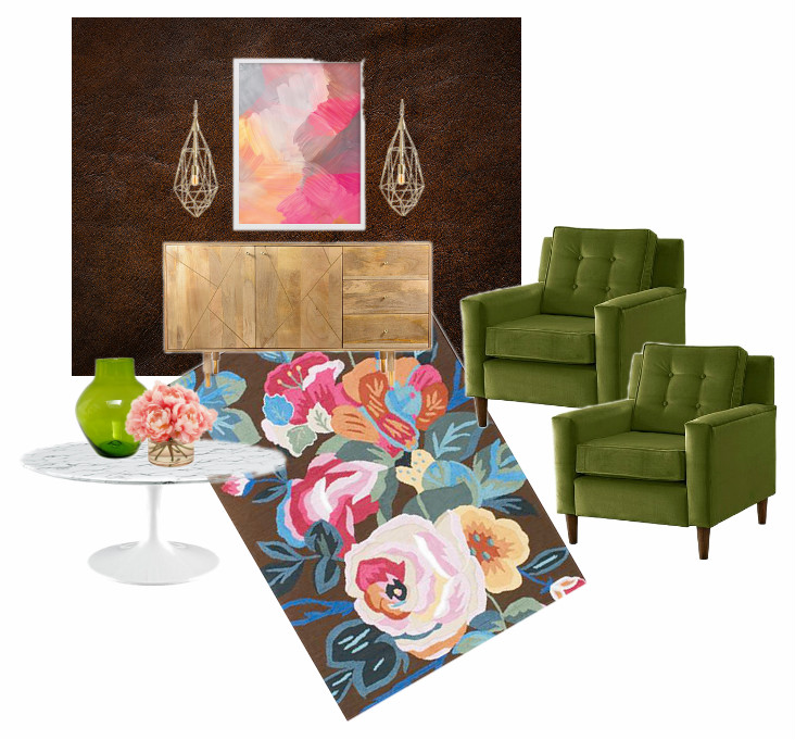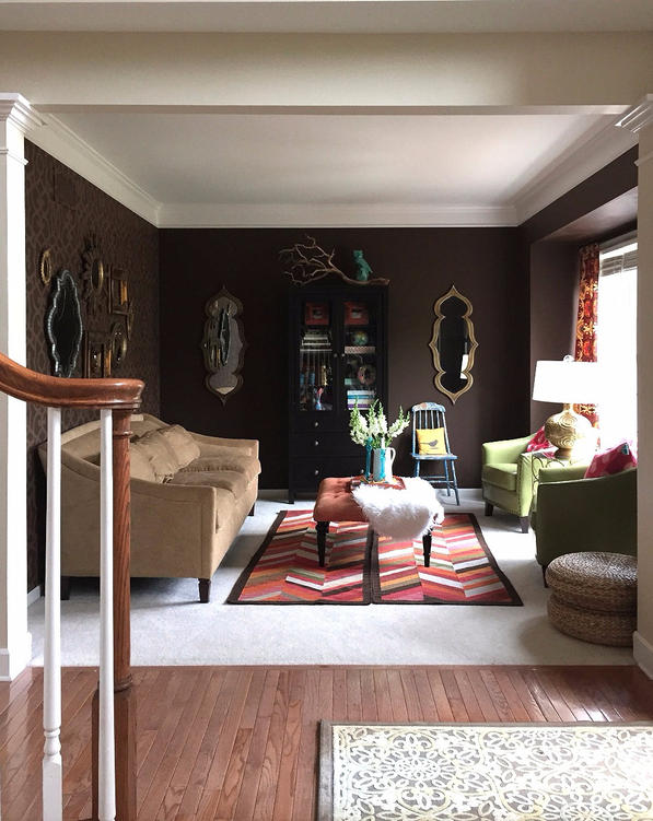 1) The rug(s) needs to go! While using two runners to form one larger rug may seem creative to some, to me it was a temporary solution to needing a bigger rug but really liking this runner from Home Goods. And since they didn’t have a bigger size, I simply butted two next to each other. But let’s face it- it isn’t ideal. So, when shopping for a rug, I needed one that incorporated the brown of the walls, but still had some fun colors I could play off of. I’ve loved this one from Anthro forever…