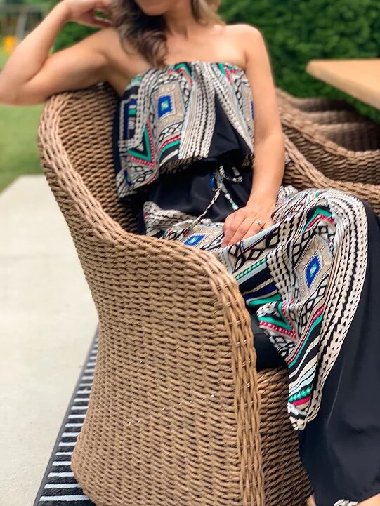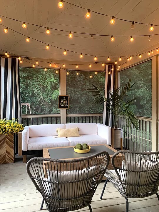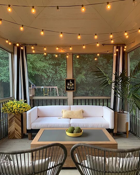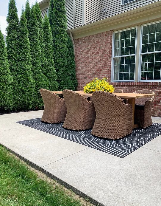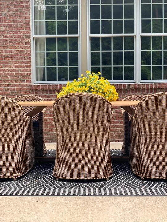 When it came time to decide what chairs to pair with it, I knew I didn’t want anything too “matchy matchy.” I don’t necessarily love the look of “sets.” I fell in love with the shape of the Tobago dining chairs. I chose the Canvas Black fabric to pull black into the space outside of the porch where the black sofa is. I love the combo. And I absolutely love the black and white rug with it too! This rug is from Sabrina Soto’s line with Unique Loom! She has a fabulous selection of outdoor pieces and I really liked the design of this one. Adds a graphic punch. Unique Loom’s indoor and outdoor rug selection is positively huge! I found one from Unique Loom for our office too!