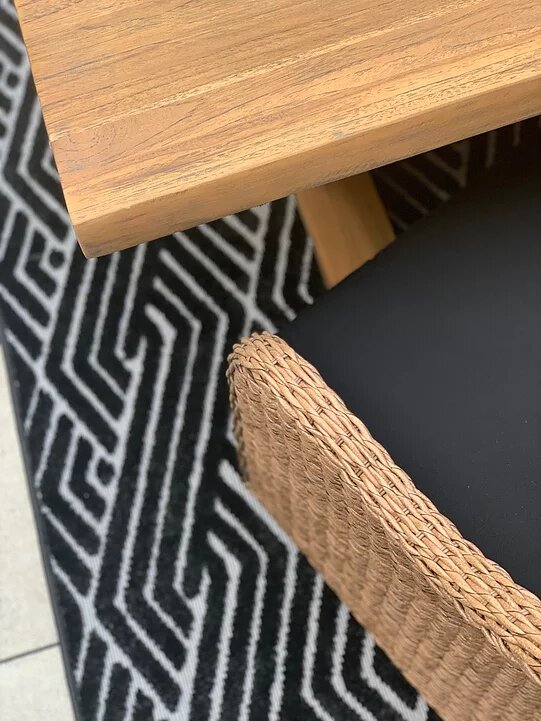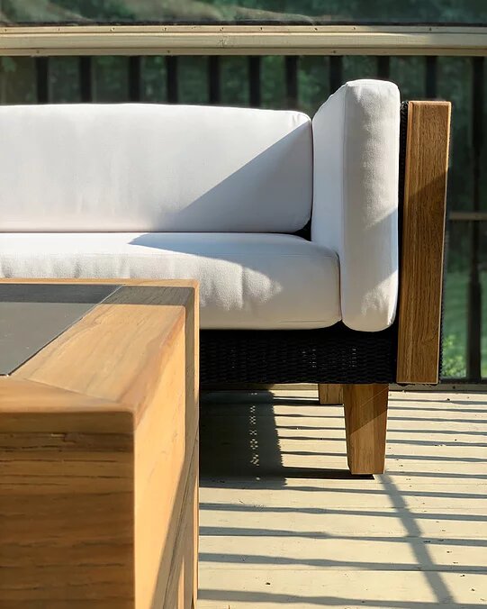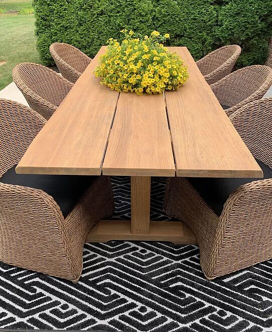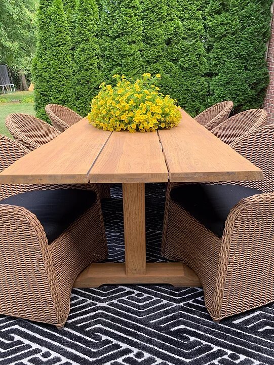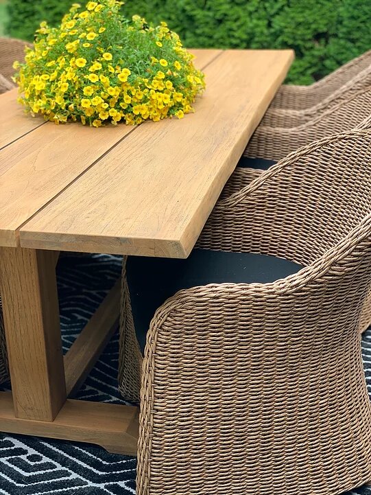 Let’s talk about these pieces. I fell in love with that 8 ft long live edge teak table the minute I laid eyes on it at High Point Market. It almost seems too nice to be outdoor furniture! But I assure you, it’ll stand the test of time. The beauty of teak comes as it ages, actually.