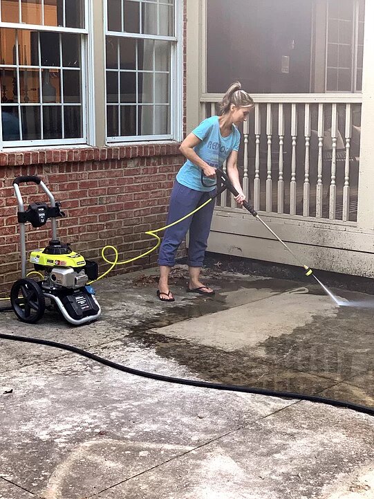I know. Please don’t judge me. Lol! We’ve just always turned a blind eye to it, so it’s sat with dated, dirty stuff for years. And the grime on the concrete, you guys! O. M. G. Let’s start with that, because cleaning it with this pressure washer from Ryobi was literally THE MOST FUN THING EVER!