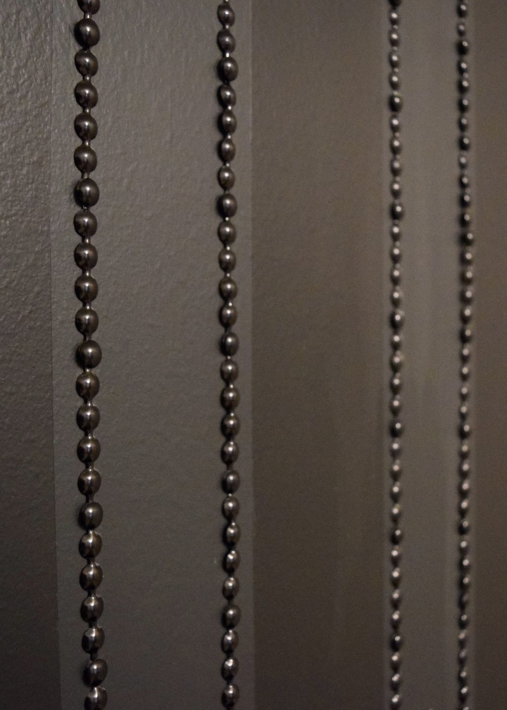 They’re meant for upholstery, and every six inches there’s a hole for you to nail in a spare nailhead. That’s how it’s attached. So I went ahead and experimented with it on a wall. I painted the wall Benjamin Moore’s Jet Black, and added stripes in Benjamin Moore’s Graphite, which is just a slightly lighter shade of black, so the contrast is subtle. And then I ran the black nailhead strips down the sides of the lighter shade.