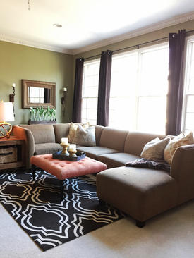 It’s a lovely room, but I started getting really tired of orange a few months ago, and went about making the room a little more neutral. (You can read about that HERE).  But recently, the green walls have been begging for a fresh new color, the rug (as much as I love it) has seen better days, and I have a few things I’ve been wanting to incorporate into this room. For starters, I don’t love that the sectional has so many parts and seams. Instead of being one long piece, it’s several pieces, so if you land on a seam when sitting down, it’s harder on the edges and it hurts to be honest! Aside from the sectional being uncomfortable, I don’t love that the arms are super high. When my two year old son is sitting on the end, he has a hard time seeing the television. Also, on the opposite side of the couch, I don’t love that it blocks some of the view of the fireplace. Same goes for the chaise part of it. Where it protrudes, it blocks the fireplace. When we put the fireplace on in the winter, there really isn’t a spot for me to enjoy it when sitting on the couch. We bought it in this configuration when it worked for our previous home. I found a new sectional with modern lines, slim arms, and subtle tufting…