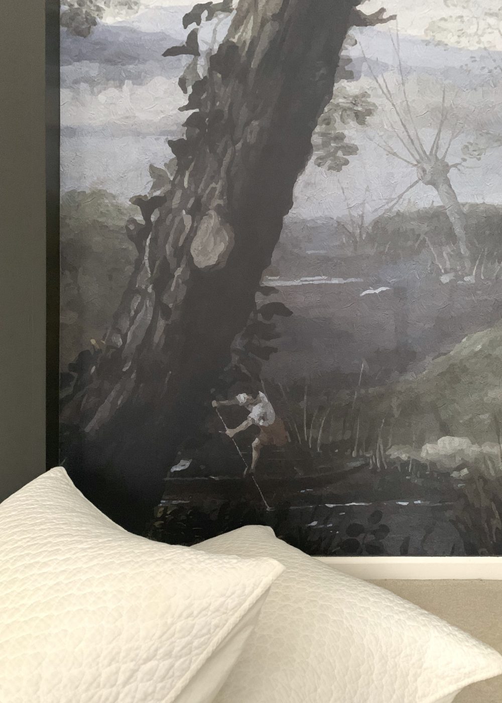 I stenciled that wall years ago, and while it’s pretty, I was itching for a bit of a refresh! And some subtle color. If you know me well, you know I love me some color, but our bedroom has always been more of a neutral sanctuary. I love it that way and want to still keep that feeling going, but I thought it could definitely stand for at least a little bit of green. So I’m pulling the outdoors in with a gorgeous landscape scene from Fine & Dandy Co!