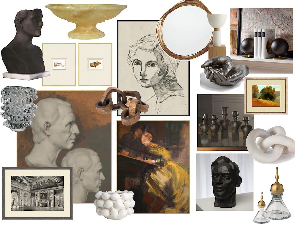 Mini men sculptures, hands sculpture, glass decanter set, iron bust, bronze head: Studio A Home