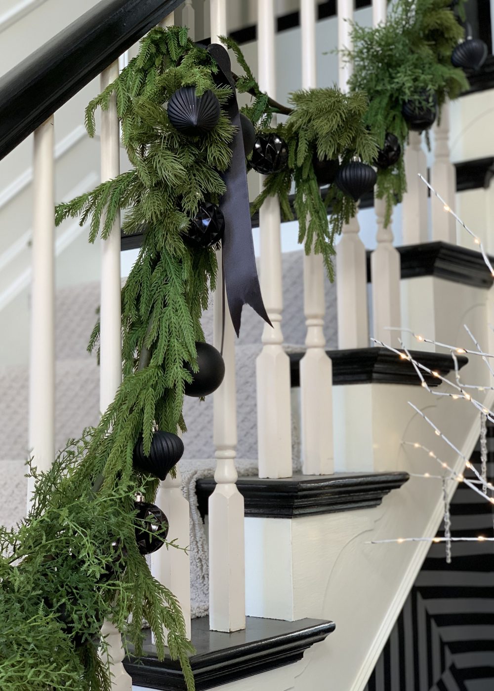I went with a chic, all black look! All of the ornaments on the garland are from Hobby Lobby. I love that they had matte ones! Some people have asked if I’ll be adding more – even if just a touch of gold, and the answer is no:) The name of the game this year is simple. Because… 2020. Lol. Or in Dwight’s famous words… “Keep it simple, stupid.”