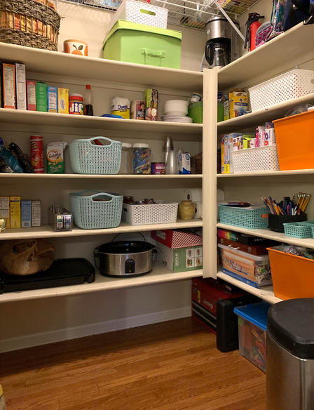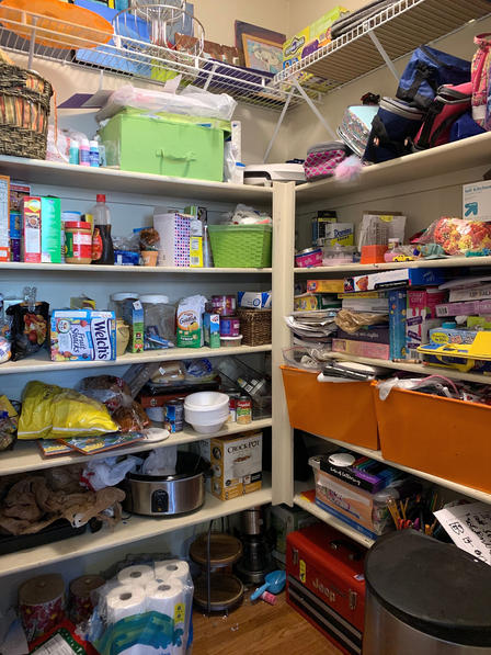 I try to have things organized by shelf. Upper shelf is more breakfast/sweet foods. Shelf below that is chips/salty snacks. Shelf below that is dinner stuff. I did a little rearranging (because of things like… why was a George Foreman grill taking up space on a shelf while our coffee maker was sitting on the floor?? When was the last time we used a George Foreman grill? 2001?) And when all was said and done, I swept the floor, sprayed a nice scent in there, and marveled at the awesomeness of it all.