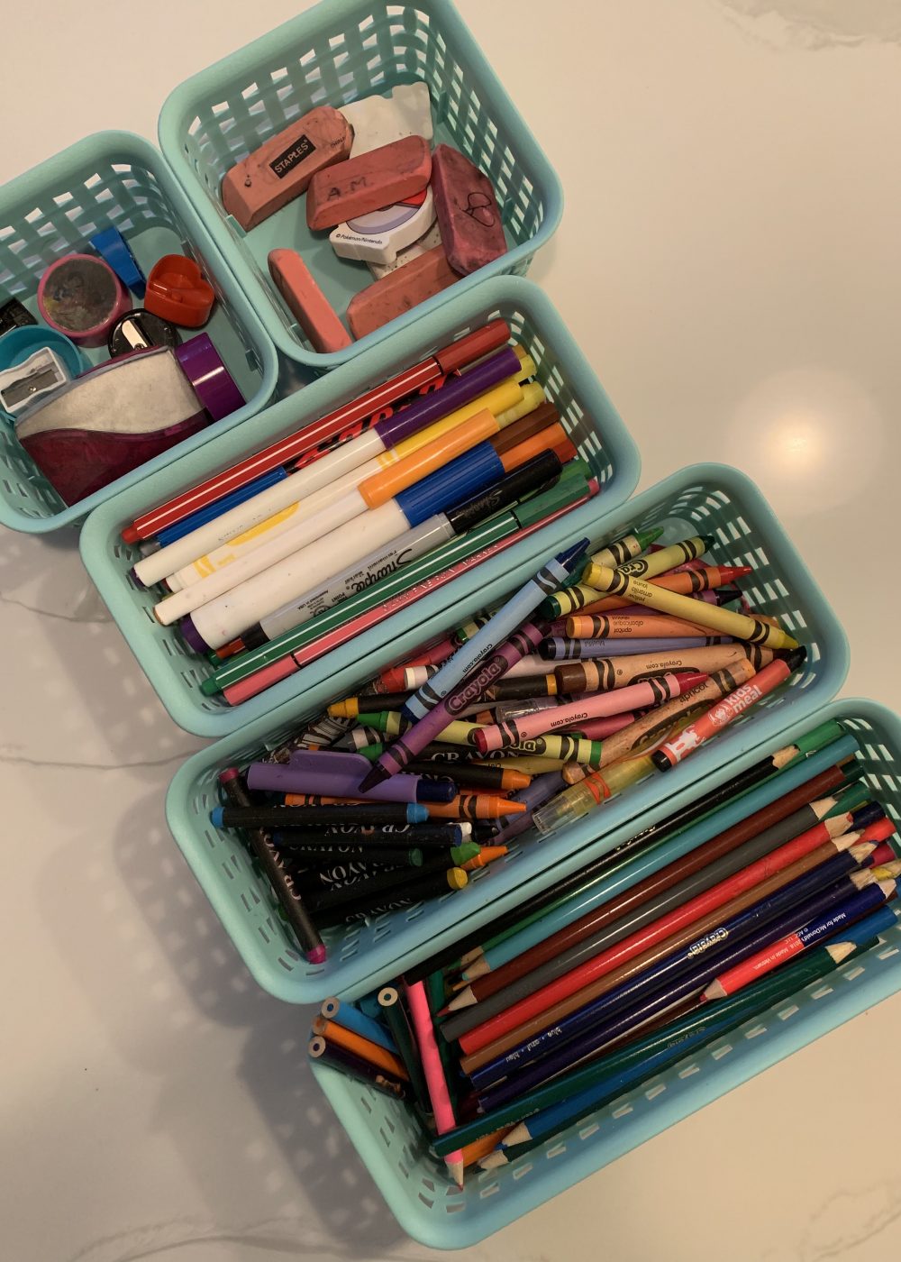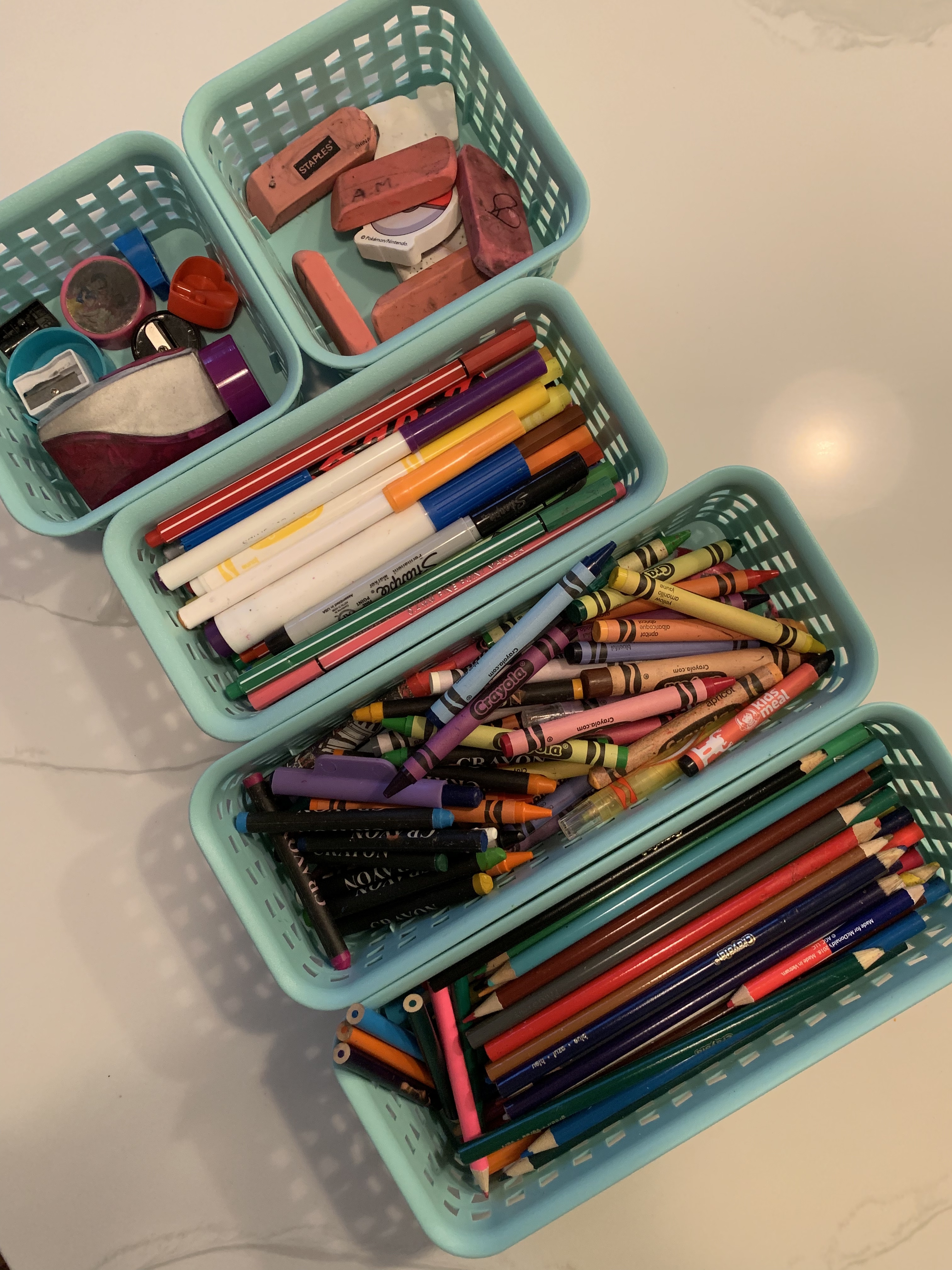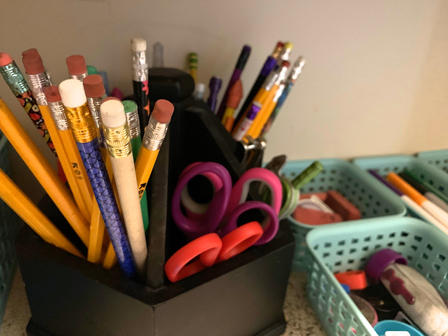 This freed up lots of space in that spinny black thing. Erasers and pencil sharpeners were crowding everything else. So now, there’s only pens, pencils, scissors/holepunch, and glue in there.