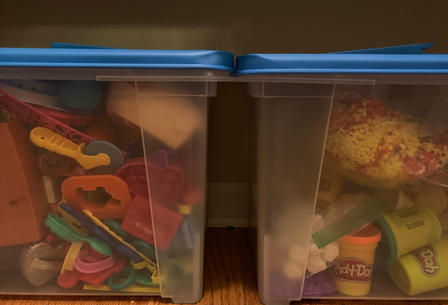I bought two separate clear bins to organize the playdoh. One holds the playdoh, the other holds all of the playdoh tools/toys.