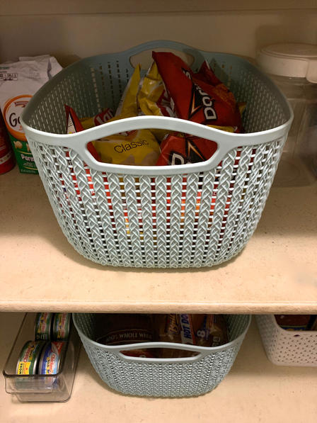 This was honestly what got me super sucked in. I became obsessed with everything having a designated/contained space. I ran to Home Goods and grabbed a bunch of different baskets and got to work. In a perfect world, I would’ve gone somewhere where I could get all baskets that matched in color/style, but I had a Home Goods gift card and “free” took precedent over “matching.” Lol. The two biggest ones were used for chip bags for the kids’ lunches, and bread.