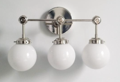Next up, I need to buy the paint for the wall and the vanity, then install the wallpaper and new light from Sazerac Stitches. I chose the light below, but in a black finish. They have this chrome option, and a brass optionas well. The brass was gorgeous, but not quite the same “gold” as the faucet, so I decided black was the safest option.
