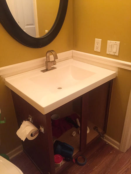 To freshen up the vanity, I’m giving it a coat of black paint, and changing out the knobs for long, modern champagne bronnze pulls.They’re such a nice compliment to the Delta faucet I picked out! Both are from Home Depot…