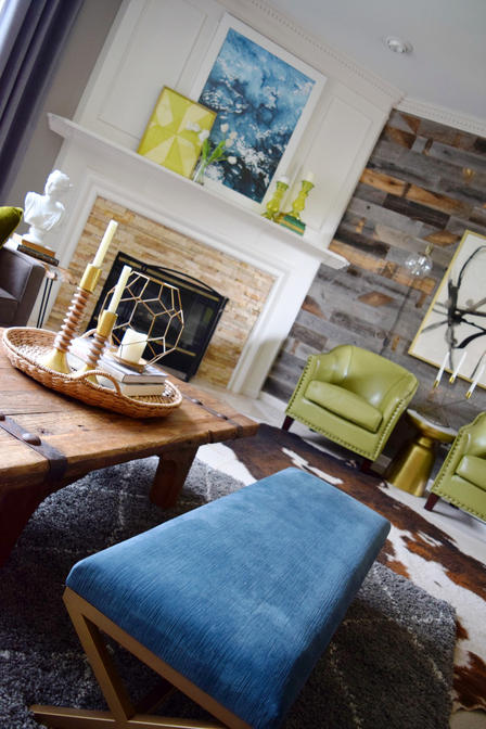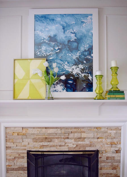 As always, I crave color when warmer weather starts. I came across a gorgeous painting from Home Goods, and things just kind of snowballed from there. Confessions of a design addict, I know;) So, along with switching up a few things on my mantel, I also busted out my green watercolor pillows from CB2, and ripped off the black and white fabric from the bench. It came with a beautiful blue velvet, so I wanted to expose that for now since it goes so well with the painting. Here’s some pix!