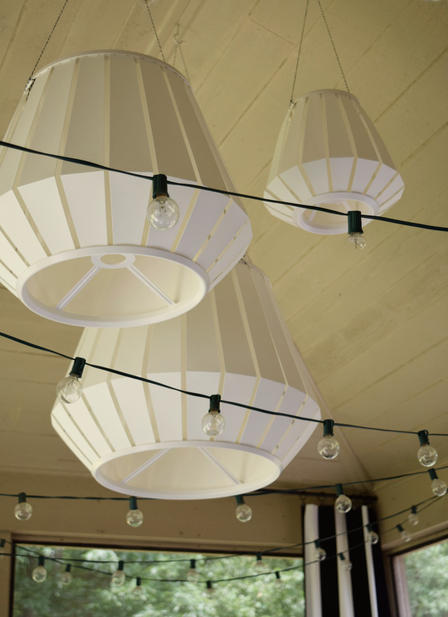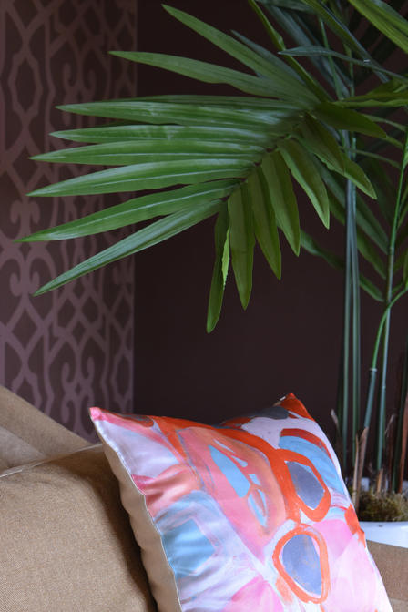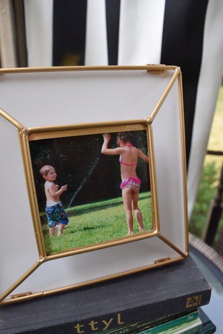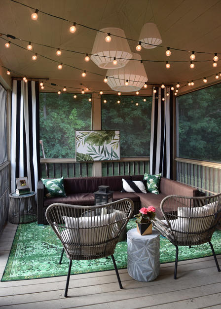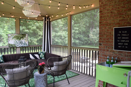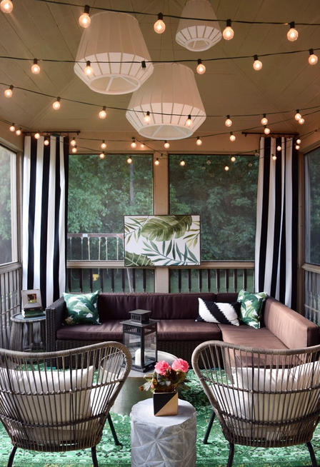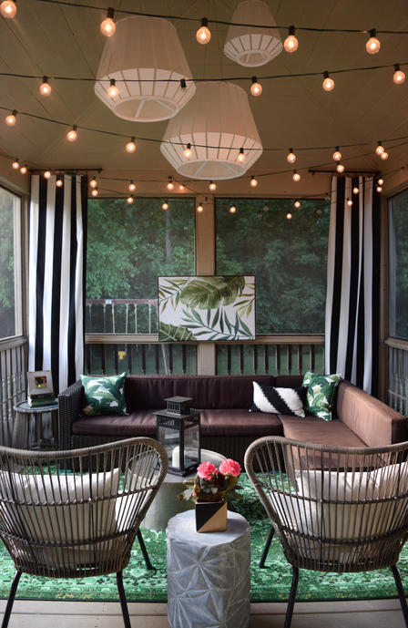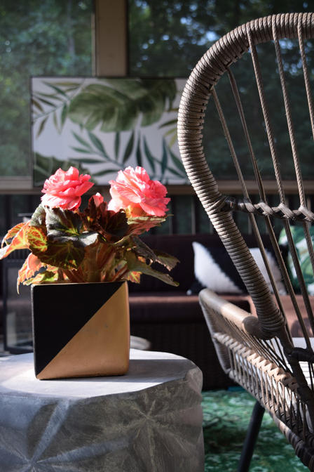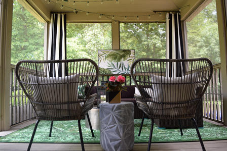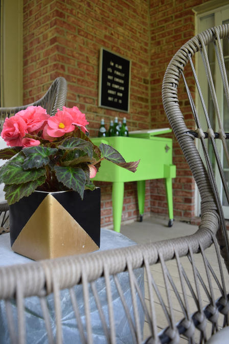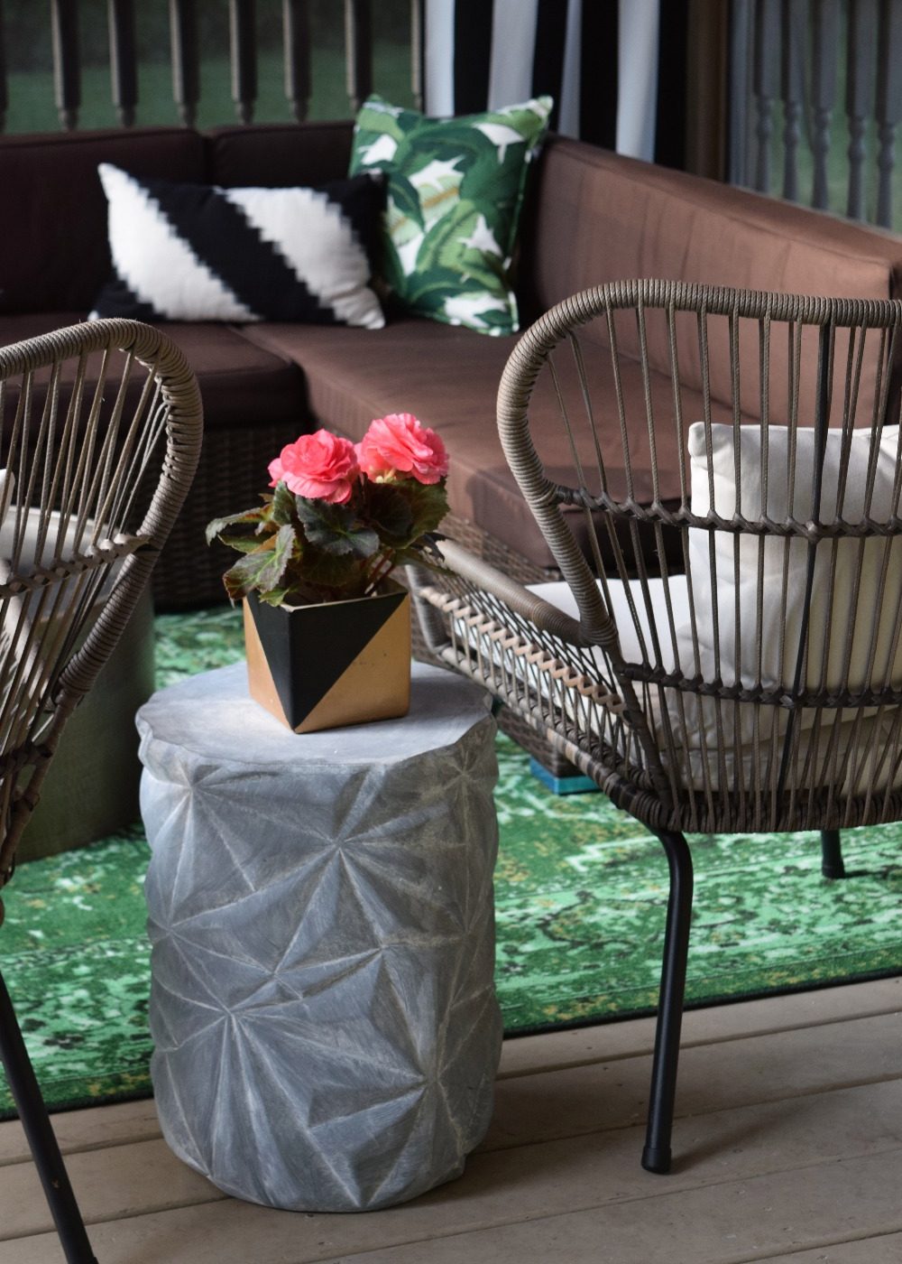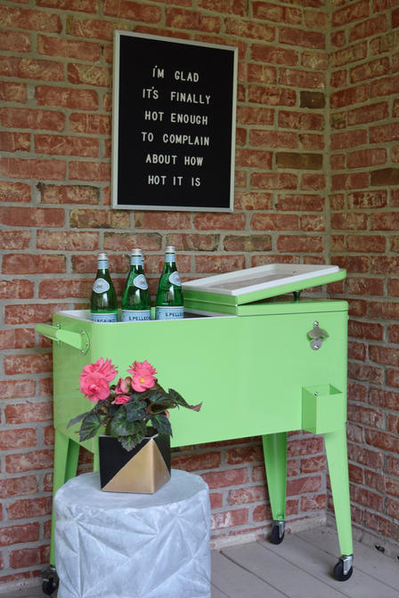 So, a few things about the back porch. First, I gotta say, adding outdoor drapes has such an impact on the vibe! I love the bold stripe. Definitely gives it the feel of a cabana. Those are DIY no-sew drapes I made a few days ago. Super easy! Also, I’ve always been torn on hanging any art of sorts, because the view is lovely on its own and I certainly didn’t want to cover it up. But the scale of this painting is small enough not obstruct the view, and I liked the palmy leaves that coordinated with the pillows. The pillows and the art are both from Home Goods! And so is the concrete geometric round side table and fun green cooler! I don’t know why we didn’t snatch one of these up years ago! We love to entertain and I never loved the look of filling up a random big tub with ice. This is way cuter!